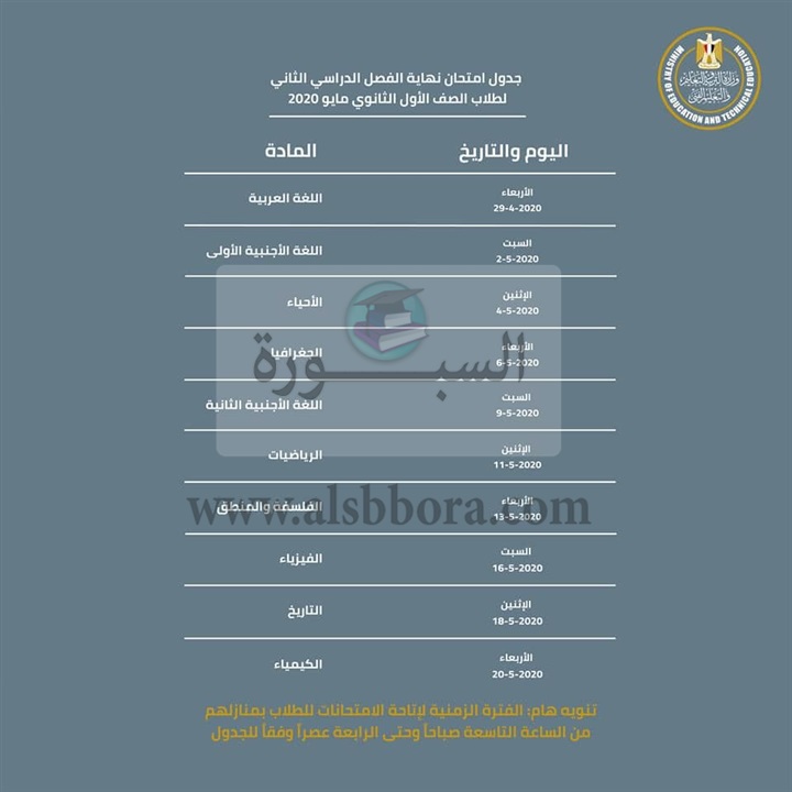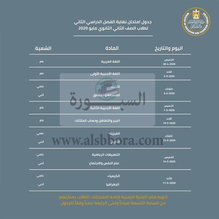 في الوقت الحالي أردنا إعلام حضراتكم بالمواعيد ونتمني استغلال الوقت في التحضير من خلال منصة التعلم علي بنك المعرفة والمنصات الإلكترونية اللتي سوف تتوفر خلال هذا الأسبوع وكذلك القنوات التعليمية.