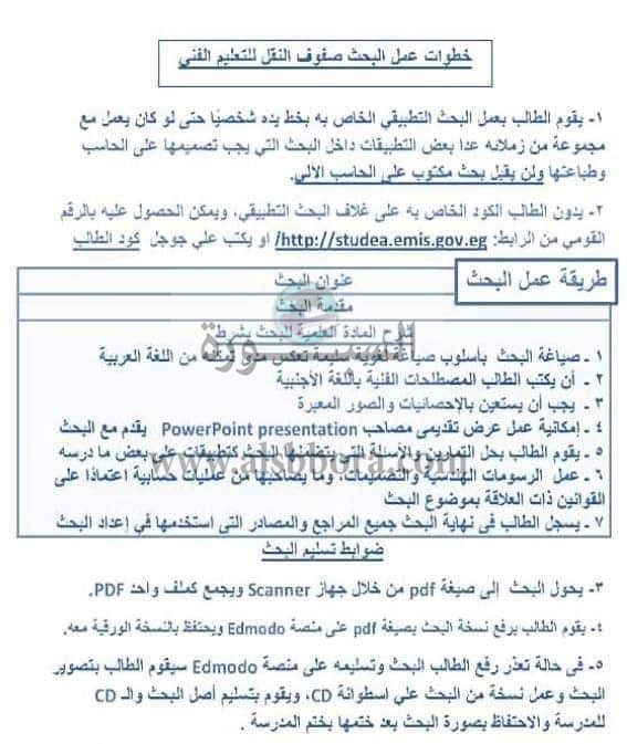 واضافت الوزارة فى بيان لها بان يقوم الطالب بعمل البحث التطبيقى الخاص به بخط يده شخصيا حتى لو كان يعمل مع مجموعة من زملائه عدا بعض التطبيقات داخل البحث اللى يجب تصميمها على الحاسب وطباعتها ولن يقبل بحث مكتوب على الحاسب الآلى.