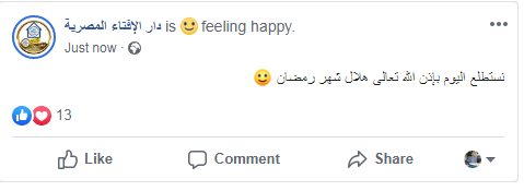 اعلنت دار الافتاء المصرية عبر صفحتها الرسمية على موقع التواصل الاجتماعى "فيس بوك" انه سيتم اليوم استطلاع هلال شهر رمضان للعام الهجرى 1441 هــ