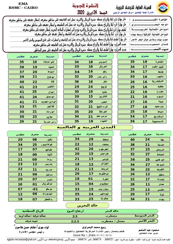 وجه خبراء هيئة الأرصاد، تخذيرا من طقس اليوم الجمعة حيث من المتوقع ان يشهد ارتفاع ملحوظ بدرجات الحرارة وطقس غير مستقر، حيث تشهد القاهرة الكبرى طقس حار نهارا بارد ليلا، وأمطار خفيفة على مناطق متفرقة ، والرياح نشطة مثيرة للرمال والأتربة تصل لحد العاصفة ، وأمطار خفيفة على مناطق متفرقة، ويشهد الوجه البحرى طقس حار نهارا بارد ليلا، وأمطار خفيفة على مناطق متفرقة ، والرياح نشطة مثيرة للرمال والأتربة تصل لحد العاصفة ، وأمطار خفيفة على مناطق متفرقة، وعلى السواحل الشمالية الغربية، طقس مائل للحرارة نهارا شديد البرودة ليلا، والرياح نشطة مثيرة للرمال والأتربة وأمطار خفيفة على مناطق متفرقة.