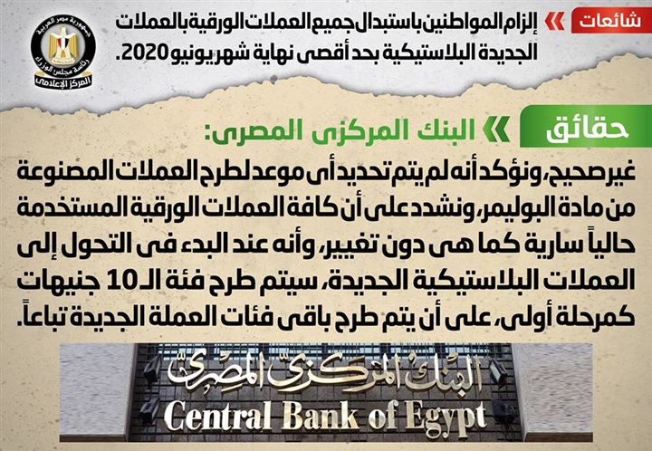 وأوضح فى تقرير رصد الشائعات للحكومة أنه لم يتم تحديد أي موعد لطرح العملات المصنوعة من مادة البوليمر، مُشدداً على أن كافة العملات الورقية المستخدمة حالياً سارية كما هي دون تغيير، وأنه عند البدء في التحول إلى العملات البلاستيكية الجديدة، سيتم طرح فئة الـ 10 جنيهات كمرحلة أولى، على أن يتم طرح باقي فئات العملة الجديدة تباعاً، مُحذراً من الانسياق وراء تلك الشائعات التي تستهدف إثارة البلبلة بين المواطنين والإضرار بالاقتصاد الوطنى.