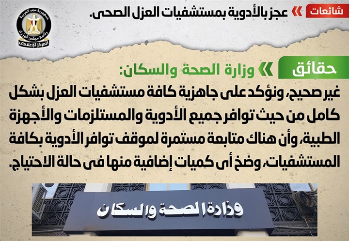 نفت وزارة الصحة ما تردد من أنباء بشأن وجود عجز بالأدوية بمستشفيات العزل الصحى، مُؤكدةً أنه لا صحة لوجود أى عجز بالأدوية بأى مستشفى من مستشفيات العزل الصحى، مُشددةً على جاهزية كل مستشفيات العزل بشكل كامل من حيث توافر جميع الأدوية والمستلزمات والأجهزة الطبية.
