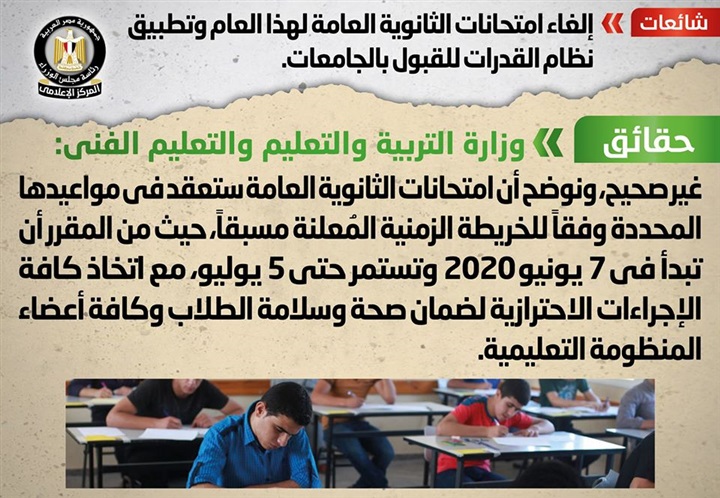 اكدت وزارة التربية والتعليم والتعليم الفنى انه غير صحيح الغاء امتحانات الثانوية العامة واكدت انها ستقام فى موعدها وفقا للخريطة الزمنية