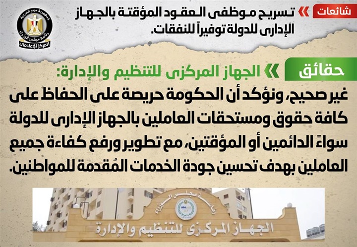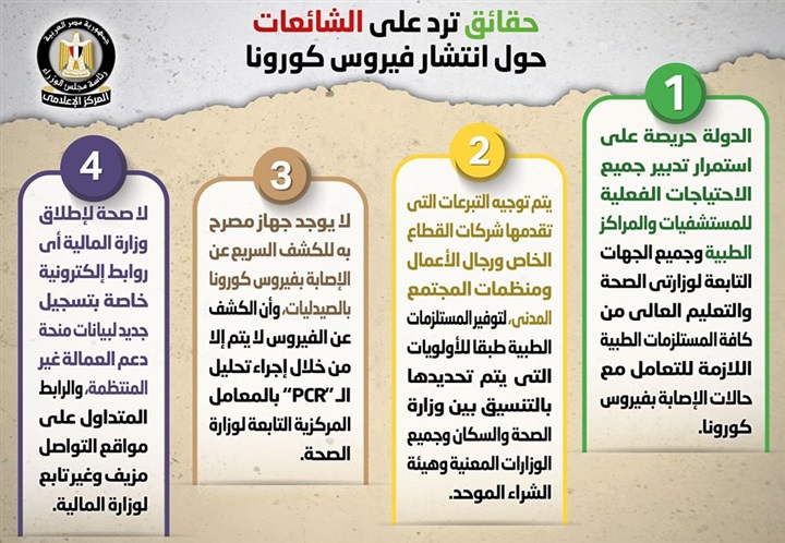 وأكد المركز انه لا صحة لإطلاق وزارة المالية أي روابط إلكترونية خاصة بتسجيل جديد لبيانات منحة دعم العمالة غير المنتظمة، والرابط المتداول على مواقع التواصل مزيف وغير تابع لوزارة المالية وانه لا صحة لاكتشاف حالات إصابة بفيروس كورونا بمؤسسات غذائية أو دوائية أو صحية خلاف ما يتم الإعلان عنه بشكل رسمي، والدولة حريصة على إعلان كافة حالات الإصابة بالفيروس بشفافية تامة.