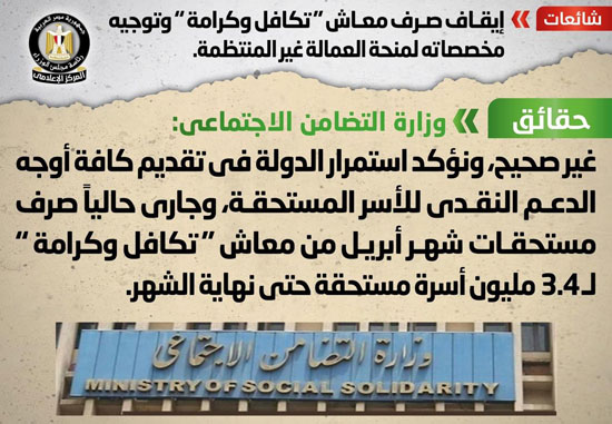 وأوضح أن كافة الشحنات الغذائية المستوردة تخضع للرقابة والفحص الدقيق للتأكد من مطابقتها لكافة الشروط والمواصفات الصحية وانه تم تخصيص الفترة من 26 أبريل 2020 وحتى 10 مايو 2020، لصرف المرحلة الثانية من منحة العمالة غير المنتظمة مع ضم كل من تخلفوا عن الصرف خلال المرحلة الأولى، مع الالتزام بضرورة وصول رسالة نصية للمستفيد لتحديد موعد ومكان الصرف.