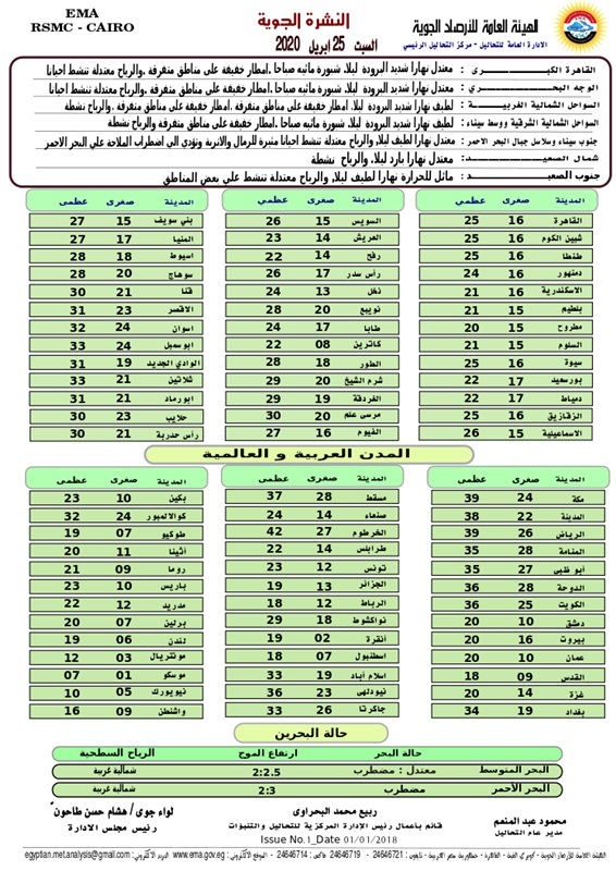 وقالت الهيئة إن الطقس سيكون لطيفا نهارا شديد البرودة ليلا على السواحل الشمالية الغربية والسواحل الشرقية ووسط سيناء.