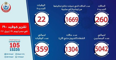 وأضاف أنه تم تسجيل 260 حالة جديدة ثبتت إيجابية تحاليلها معمليًا للفيروس، جميعهم مصريون، وذلك ضمن إجراءات الترصد والتقصي التي تُجريها الوزارة وفقًا لإرشادات منظمة الصحة العالمية، لافتًا إلى وفاة 22 حالة جديدة.