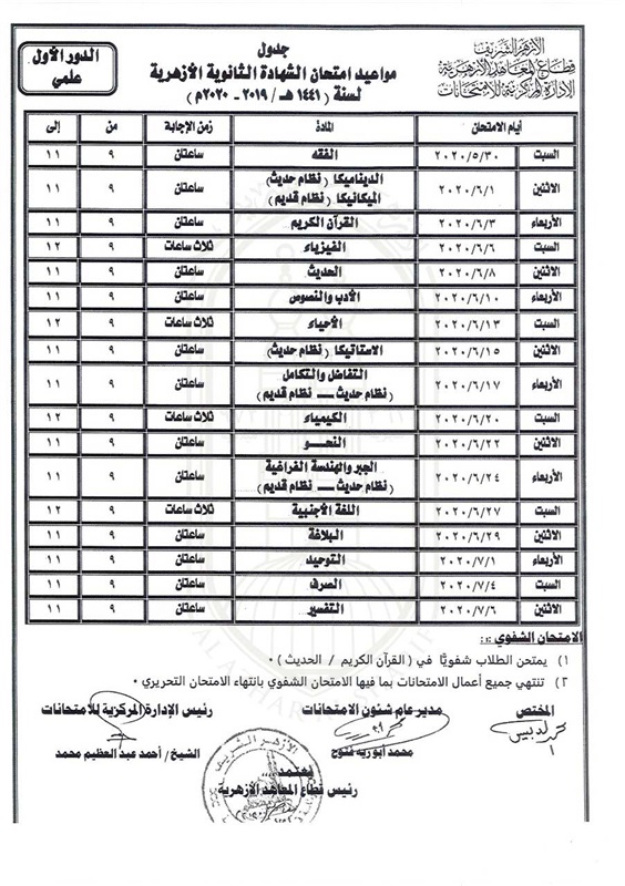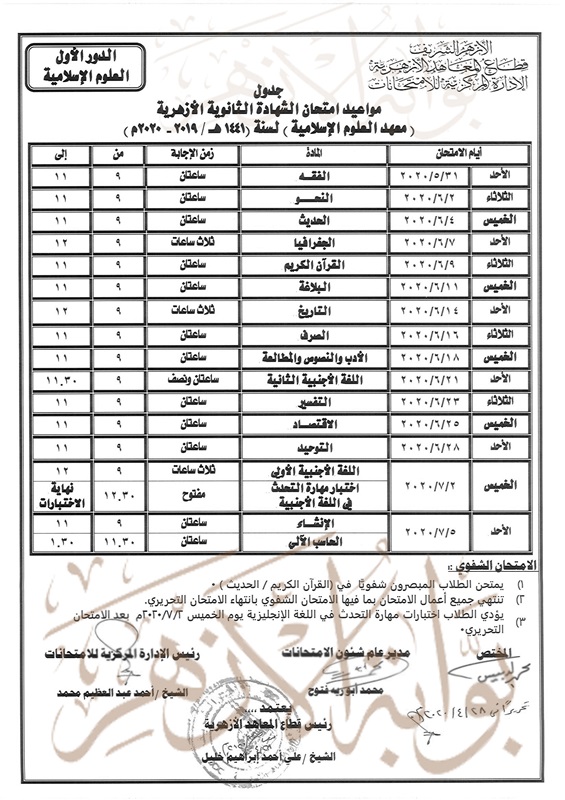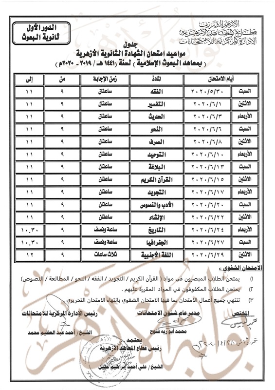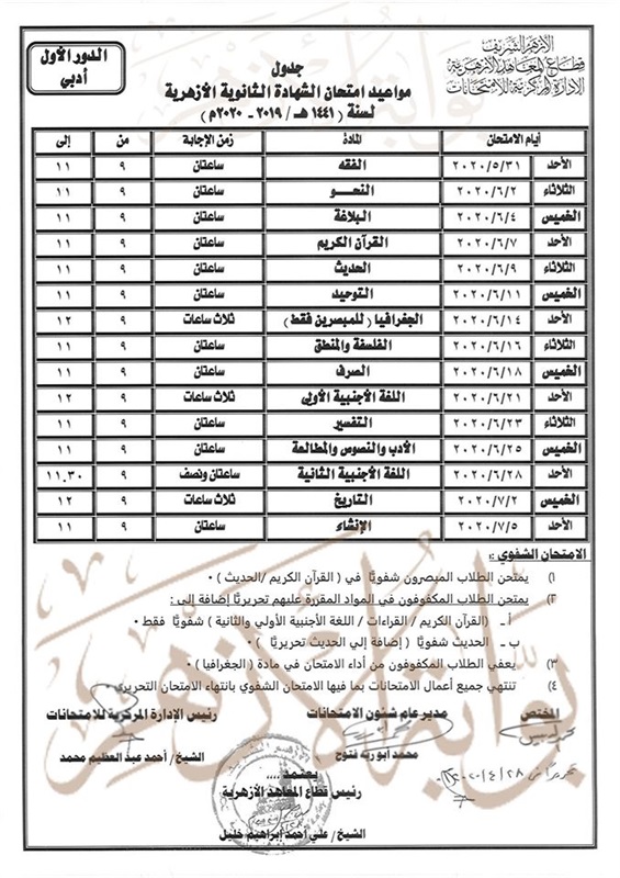 ولا يعتد بأي جدول صادر قبل 28 /4/ 2020 ، خاص بامتحانات القسم الأدبي، أو ثانوية البعوث الإسلامية، أو معهد العلوم الإسلامية.