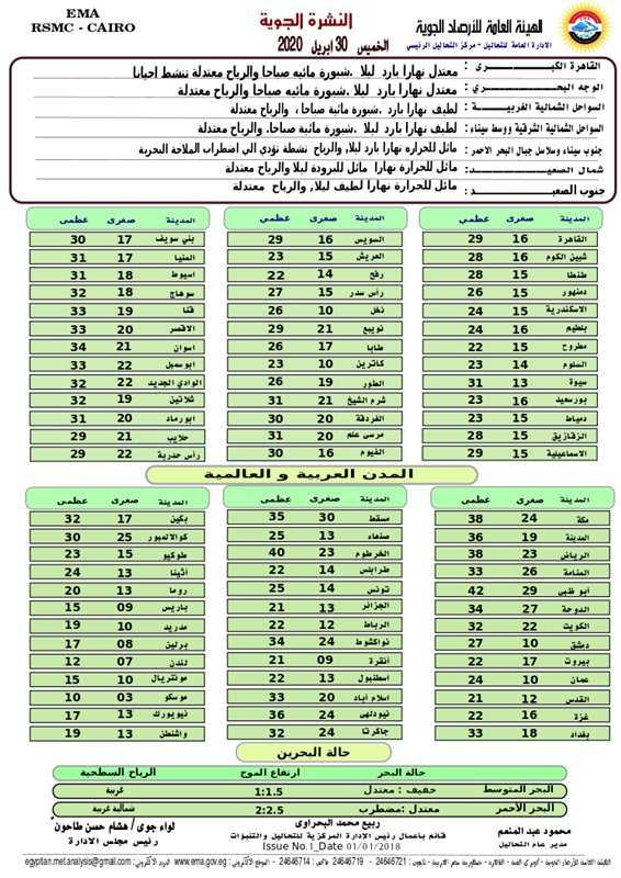 يتوقع خبراء هيئة الأرصاد، أن يشهد غدا الخميس، ارتفاع طفيف بدرجات الحرارة، حيث تشهد القاهرة الكبرى طقس معتدل نهارا بارد ليلا، وشبورة مائية صباحا، والرياح معتدلة تنشط أحيانا، ويشهد الوجه البحرى طقس معتدل نهارا بارد ليلا، وشبورة مائية صباحا، والرياح معتدلة، وعلى السواحل الشمالية الغربية، طقس لطيف نهارا بارد ليلا، وشبورة مائية صباحا، والرياح معتدلة.