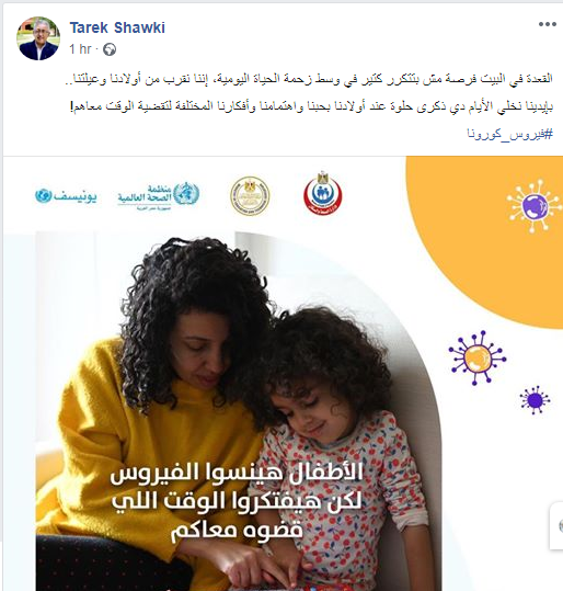 قال وزير التربية والتعليم عبر حسابه الرسمي على موقع التواصل الاجتماعي فيس بوك : "القعدة في البيت فرصة مش بتتكرر كتير في وسط زحمة الحياة اليومية، إننا نقرب من أولادنا وعيلتنا.. بإيدينا نخلي الأيام دي ذكرى حلوة عند أولادنا بحبنا واهتمامنا وأفكارنا المختلفة لتقضية الوقت معاهم!"
