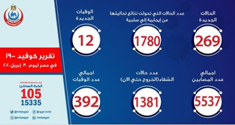 وذكر "مجاهد" أن إجمالي العدد الذي تم تسجيله في مصر بفيروس كورونا المستجد حتى اليوم الخميس، هو 5537 حالة من ضمنهم 1381 حالة تم شفاؤها وخرجت من مستشفيات العزل والحجر الصحي، و 392 حالة وفاة.