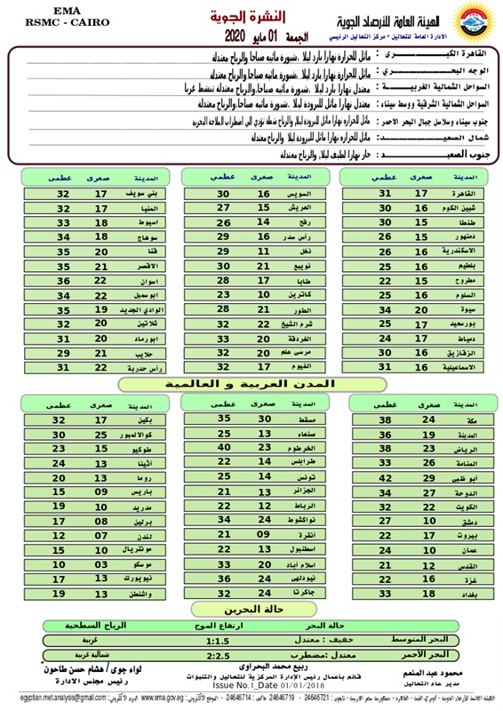 وقال الخبراء، إن السواحل الشمالية الشرقية ووسط سيناء، تشهد طقس معتدل نهارا مائل للبرودة ليلا، وشبورة مائية صباحا، والرياح معتدلة، وفى جنوب سيناء وسلاسل جبال البحر الأحمر، طقس مائل للحرارة نهارا مائل للبرودة ليلا، والرياح نشطة وتؤدى لاضطراب الملاحة البحرية ، وفى شمال الصعيد طقس مائل للحرارة نهارا مائل للبرودة ليلا وشبورة مائية صباحا والرياح معتدلة، ويشهد جنوب الصعيد طقس حار نهارا لطيف ليلا، والرياح معتدلة.