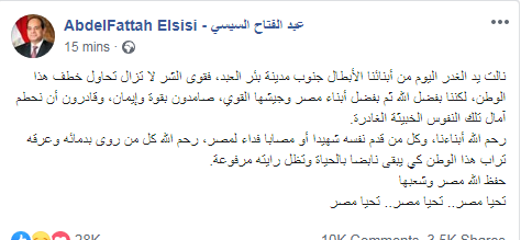 قال الرئيس عبدالفتاح السيسى، نالت يد الغدر اليوم من أبنائنا الأبطال جنوب مدينة بئر العبد، فقوى الشر لا تزال تحاول خطف هذا الوطن، لكننا بفضل الله ثم بفضل أبناء مصر وجيشها القوي، صامدون بقوة وإيمان، وقادرون أن نحطم آمال تلك النفوس الخبيثة الغادرة.