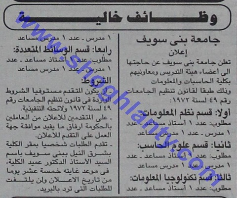تعلن جامعة بني سويف عن حاجتها إلي اعضاء هيئة تدريس ومعاونيهم وذلك طبقا لقانون تنظيم الجامعات رقم 49 لسنة 1972.