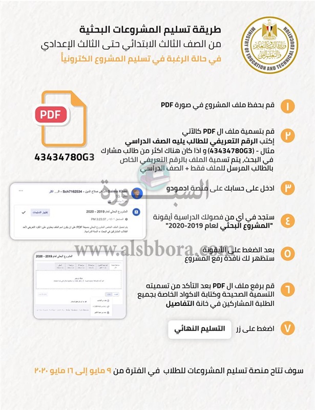 اعلنت وزارة التربية والتعليم والتعليم الفنى منذ قليل طريقة تسليم المشروعات البحثية لطلاب المدارس من الصفوف الثالث الابتدائى الى الثالث الاعدادى، والتى جاءت كالتالى:
