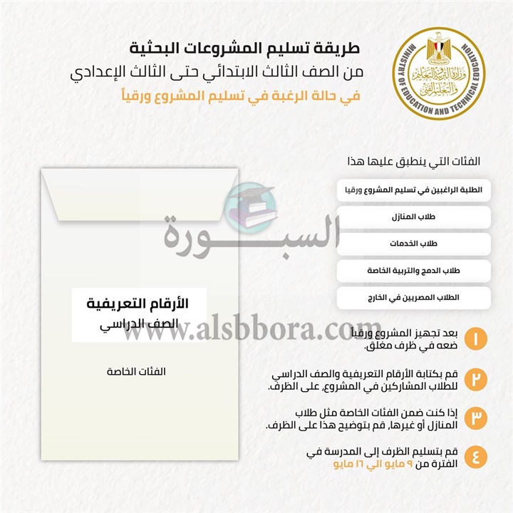 بالانفجراف.. طريقة تسليم المشروعات البحثية للطلاب من 3 ابتدائى حتى 3 اعدادى ورقيا