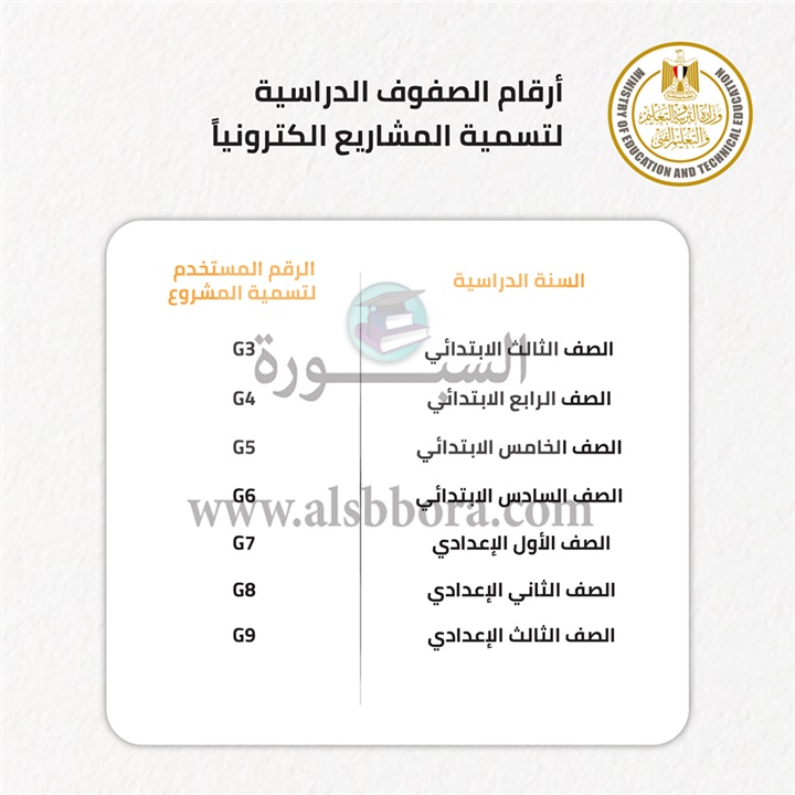 كما اعلنت عن ارقام الصفوف الدراسية لتسمية المشروعات البحثية الكترونيا، من خلال الانفوجراف التالى: