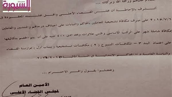 وافق مجلس القضاء الاعلي في جلسته المهقودة في 6/7/2015 علي صرف مكافأة تشجيعية للعاملين بالمحاكم والنيابات علي اختلاف درجاتهم والمنتدبين والعاملين بمكافأة شاملة شهر علي الراتب الاساسي وخمس علاوات.