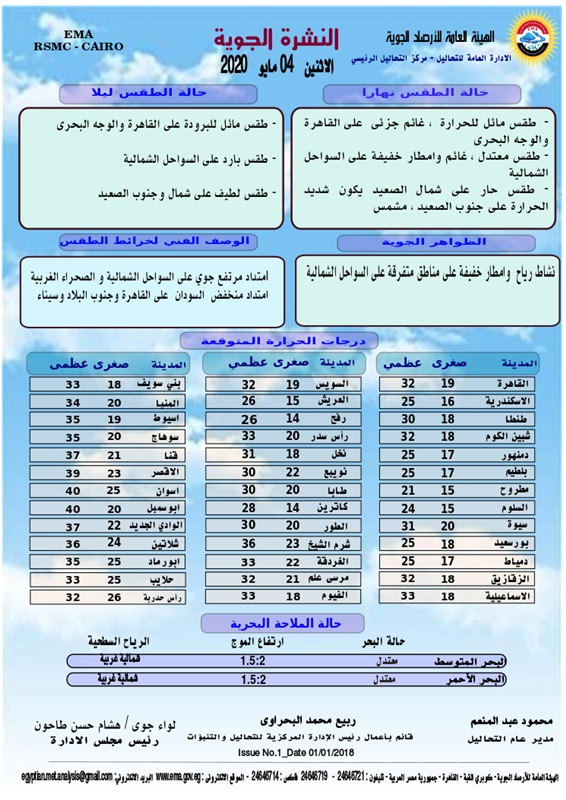 يتوقع خبراء هيئة الأرصاد، أن يشهد غدا الإثنين، استمرار ارتفاع درجات الحرارة ، حيث تشهد القاهرة الكبرى والوجه البحرى نهارا طقس مائل للحرارة غائم جزئى، كما يسود طقس معتدل غائم وأمطار خفيفة على السواحل الشمالية، ويسود طقس حار على شمال الصعيد يكون شديد الحرارة على جنوب الصعيد مشمس.