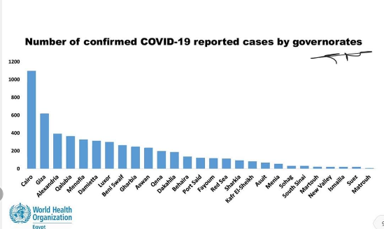 اعلنت منظمة الصحة العالمية عن ترتيب محافظات الجمهورية من حيث أعلى إصابات بفيروس كورونا وجاء ترتيب المحافظات الخمسة الأولي كالتالي القاهرة ثم الجيزة ثم الإسكندرية ثم القليوبية ثم المنوفية ثم دمياط .