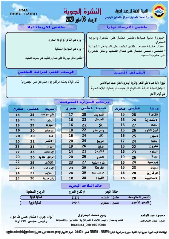 أعلنت هيئة الأرصاد الجوية حالة الطقس اليوم الأربعاء حيث من المتوقع أن يسود طقس معتدل نهارا بارد ليلا على القاهرة الكبرى والوجه البحرى مع سقوط أمطار خفيفة على أماكن متفرقة مع شبورة مائية.