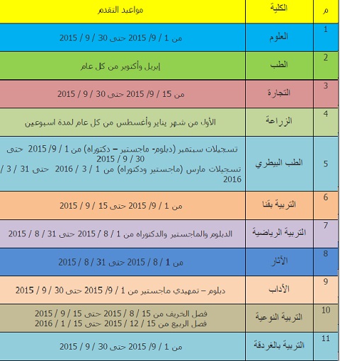 تعلن جامعة جنوب الوادي بقنا عن قبول دفعة جديدة من طلاب الدراسات العليا " دبلوم – ماجستير - دكتوراه" في العام الجامعي 2015 / 2016 بكليات الجامعة المختلفة وبيان الكليات كالتالي :