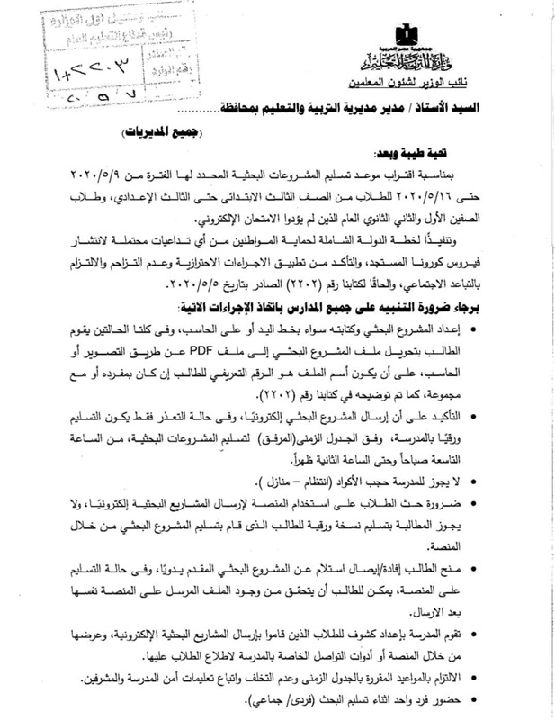 اصدرت وزارة التربية والتعليم تعليمات هامة للمديريات التعليمية وذلك بخصوص طرق تسليم الابحاث للطلاب عن طريق التسليم الورقى للمدارس