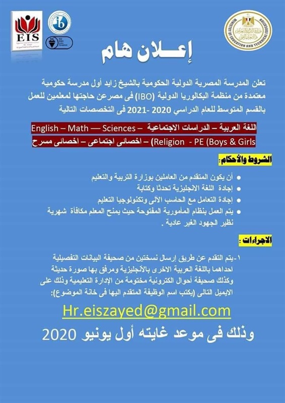 تعلن المدرسة المصرية الدولية الحكومية بالشيخ زايد عن حاجتها لمعلمين للعمل بالقسم المتوسط وفقا للتخصصات التالية :