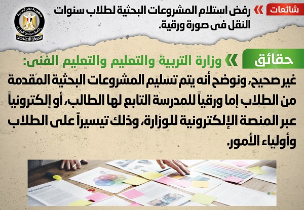 تردد في بعض وسائل الإعلام والمواقع الإلكترونية وصفحات التواصل الاجتماعي أنباء بشأن رفض استلام المشروعات البحثية لطلاب سنوات النقل في صورة ورقية، وقد قام المركز الإعلامي لمجلس الوزراء بالتواصل مع وزارة التربية والتعليم والتعليم الفني، والتي نفت تلك الأنباء، مُؤكدةً أنه لا صحة لرفض استلام المشروعات البحثية لطلاب سنوات النقل في صورة ورقية، مُوضحةً أنه يتم تسليم المشروعات البحثية المقدمة من الطلاب إما ورقياً للمدرسة التابع لها الطالب، أو إلكترونياً عبر المنصة الإلكترونية للوزارة، وذلك تيسيراً على الطلاب وأولياء الأمور.
