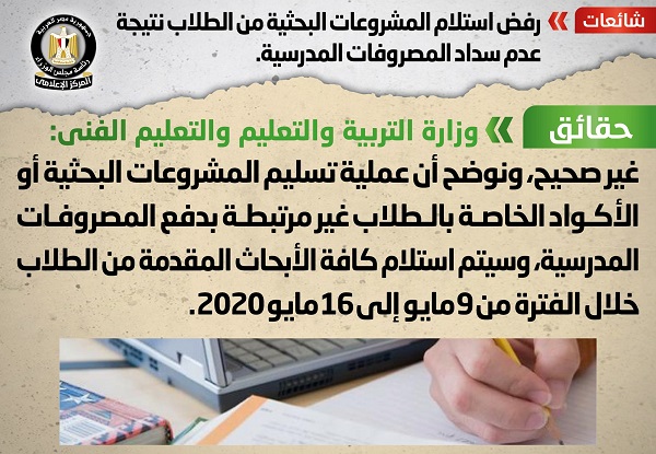 تردد في بعض وسائل الإعلام والمواقع الإلكترونية وصفحات التواصل الاجتماعي أنباء بشأن رفض استلام المشروعات البحثية من الطلاب نتيجة عدم سداد المصروفات المدرسية، وقد قام المركز الإعلامي لمجلس الوزراء بالتواصل مع وزارة التربية والتعليم والتعليم الفني، والتي نفت تلك الأنباء، مُؤكدةً أنه لا صحة لرفض استلام المشروعات البحثية من الطلاب نتيجة عدم سداد المصروفات المدرسية.