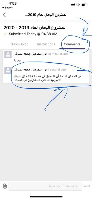 اذا كان هناك فريق عمل سيكون اسم الملف باسم الطالب الذي يقوم برفعه حسب الإرشادات (الرقم التعريفي متبوعًا بالسنة الدراسية) ثم نكتب الارقام التعريفية لباقي الطلاب في المجموعة "في خانة التفاصيل" كما هو موضح في الصور.