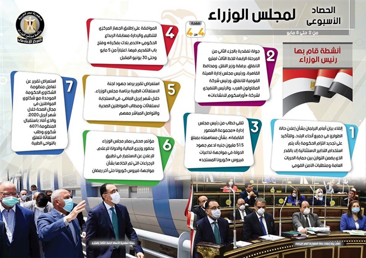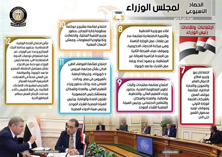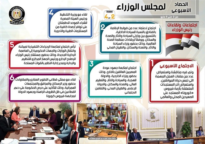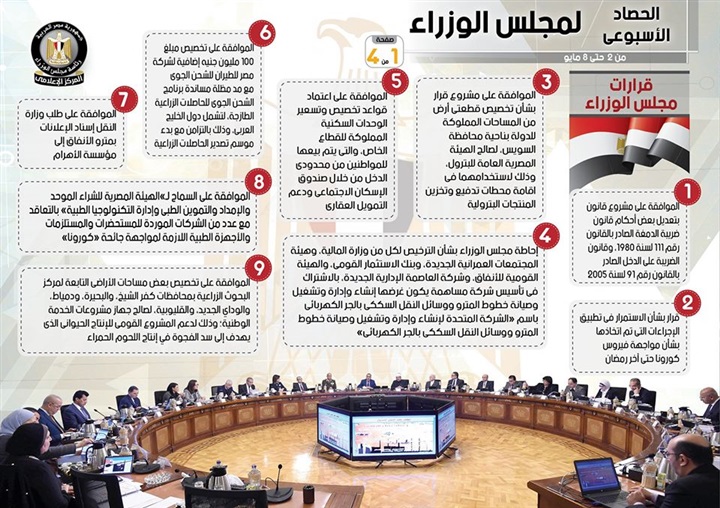نشر المركز الاعلامى لمجلس الوزراء اهم القرارت التى اصدرها مجلس الوزراء وكذالك اهم المقوانين التى تمت الموافقة عليها وذلك خلال الفترة من 2 مايو حتى 8 مايو 2020