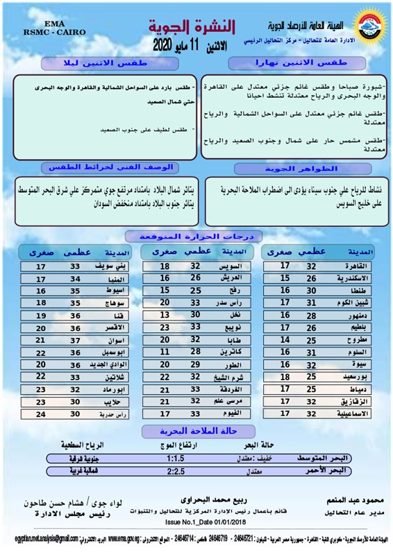 من المتوقع أن يسود ليلا طقس بارد على القاهرة الكبرى والوجه البحرى و السواحل الشمالية حتى شمال الصعيد، لطيف على جنوب الصعيد وأن يكون الطقس نهارا غائم معتدل على السواحل الشمالية وطقس مشمس حار على الصعيد ، مع وجود نشاط بالرياح مما يؤدى إلى اضطراب حركة الملاحة بخليج السويس.