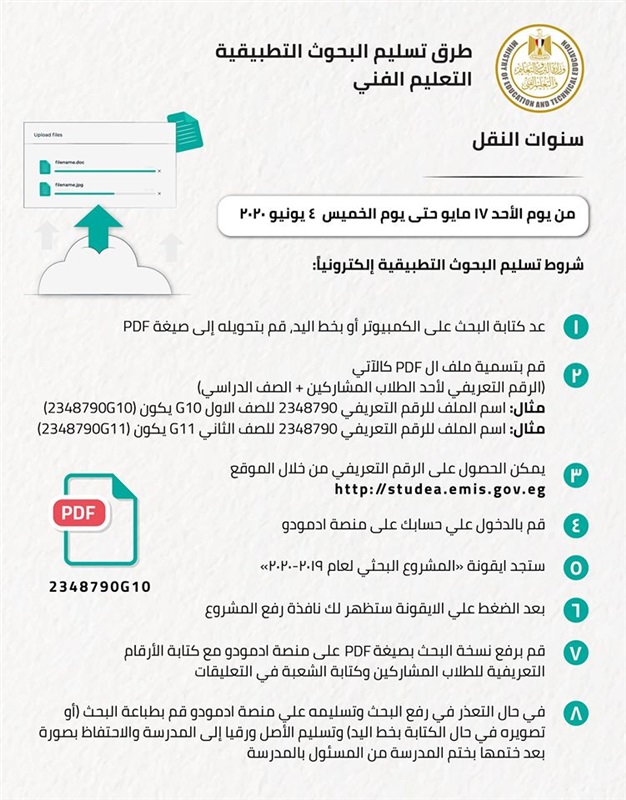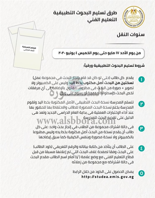 وأوضحت الوزارة أنه تم تقديم مواعيد تسليم المشاريع البحثية لطلاب سنوات النقل بمدارس التعليم الفني، لتيسير استلام البحوث وإعطاء فرصة أطول للطلاب أثناء فترة التقدم لمنع حدوث كثافة على المنصة عند تسليم البحوث إلكترونيا، وكذلك لمنع وتفادي حدوث تجمعات من الطلاب بالمدارس أثناء فترة تقديم الأبحاث التطبيقية ورقيا (لمن يتعذر عليه التقديم إلكترونيا) حفاظًا على صحة الطلاب ومنع انتشار فيروس كورونا.