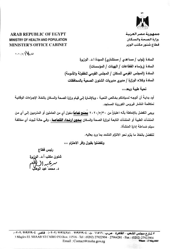 أعلنت وزارة الصحة والسكان عن حظر ومنع الدخول للعاملين بها والمترددين علي منشآتها سواء كانت منشآت طبية أو إدارية تابعة للوزارة بدون ارتداء الكمامة وحال ثبوت أى مخالفة سيتم مساءلة إدارة المنشأة.