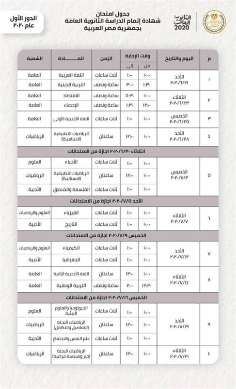 وتبدأ امتحانات الدور الأول لشهادة اتمام الدراسة الثانوية العامة للعام الدراسي 2020/2019 اعتبارًا من يوم الأحد الموافق 21 يونيو 2020 وتستمر حتى يوم الثلاثاء 21 يوليو 2020.