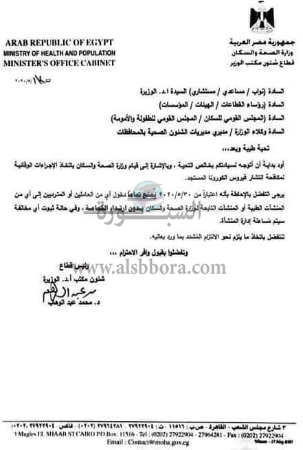 وجاء قرار وزارة الصحة بانه يرجى التفضل بالاحاطة باعتبار من 30 مايو الجارى يمنع تماما دخول اى من العاملين او المترددين الى اى من المنشأت الطبية او المنشأت التابعة لوزارة الصحة والسكان بدون ارتداء الكمامة وفى حالة ثبوت اى مخالفة سيتم مساءلة ادارة المنشأة.