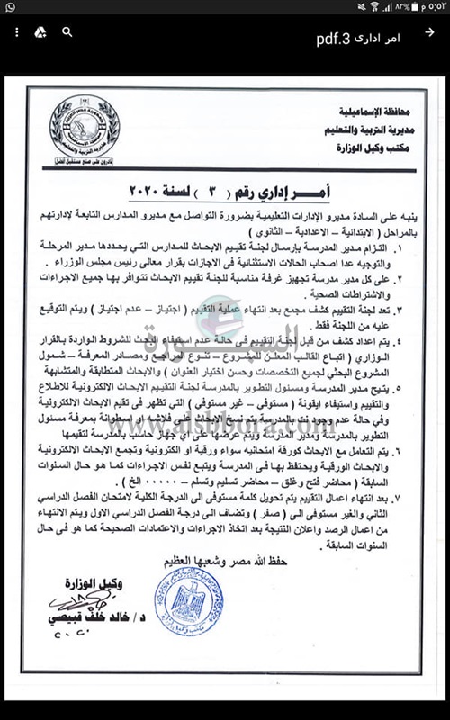 أصدر الدكتور خالد خلف قبيصي مدير مديرية التربية والتعليم بمحافظة الإسماعيلية اليوم الاثنين امرا إداريا رقم 3 لسنة 2020 لتنظيم عملية تقييم الأبحاث الطلابية الخاص المرحلتين الابتدائية والإعدادية بدءا من الصف الثالث الابتدائى حتي الصف الثانى الاعداداى.