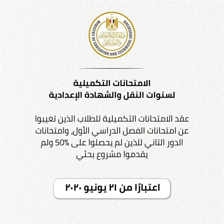 اعلنت وزارة التربية والتعليم عن تحديد موعد عقد الامتحانات التكميلية لطلاب سنوات النقل والشهادة الإعدادية الذين تغيبوا عن امتحانات الفصل الدراسي الأول بعذر قهري مقبول، وذلك اعتبارًا من ٢١ يونيو ٢٠٢٠ وفقًا للقواعد المنظمة في هذا الشأن وظروف كل مديرية، مع الإلتزام الكامل بتطبيق الإجراءات الاحترازية والتباعد الاجتماعي للحفاظ على سلامة أبنائنا الطلاب.
