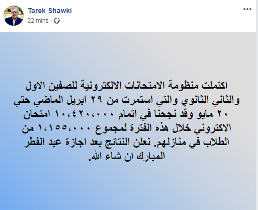 وقال وزير التربية والتعليم في تصريحات له عبر حسابه الرسمي على موقع التواصل الاجتماعي فيس بوك : اكتملت منظومة الامتحانات الالكترونية للصفين الاول والثاني الثانوي والتي استمرت من ٢٩ ابريل الماضي حتي ٢٠ مايو وقد نجحنا في اتمام ١٠،٤٢٠،٠٠٠ امتحان الاكتروني خلال هذه الفترة لمجموع ١،١٥٥،٠٠٠ من الطلاب في منازلهم. نعلن النتائج بعد اجازة عيد الفطر المبارك ان شاء الله.