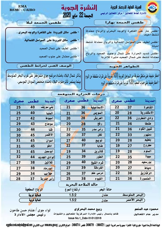 ومن المتوقع أن يكون الطقس نهارا لطيفا على السواحل الشمالية وشديد الحرارة على الصعيد مع نشاط للرياح المثيرة للأتربة.