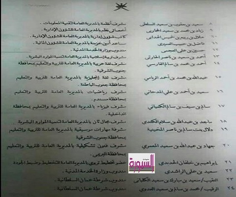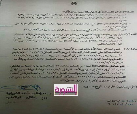 اصدرت وزارة التربية والتعليم بسلطنة عمان قرارا بتشكيل لجنة الاعارات والتعاقدات لاعضاء هيئة التدريس من جمهورية مصر العربية للعام الدراسي 2015\2016 برئاسة الدكتور \ سعيد بن سالم بن حمد الحارثي مستشار وزيرة التربية والتعليم بسلطنة عمان، وستبدأ اللجنة عملها من يوم الاحد الموافق 26\7\2015 وتنتهي يوم الجمعة الموافق 14\8\2015.