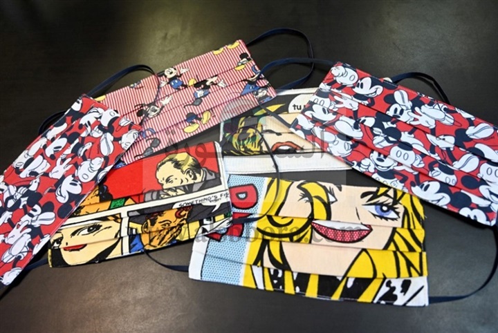 ( كمامات ) بألوان واشكال واقمشة مختلفة مغطاة بعلامات تجارية واكسسوارات وزهور.