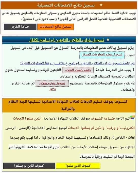 دشنت وزارة التربية والتعليم والتعليم الفنى تطبيق إلكتروني جديد لتسجيل نتائج إمتحانات الطلاب عبر موقع إستمارة التلميذ والتسجيل يتضمن ( ناجح - راسب - له دور ثانى - منقطع )، وإتاحة طباعة التقرير في نهاية التسجيل.