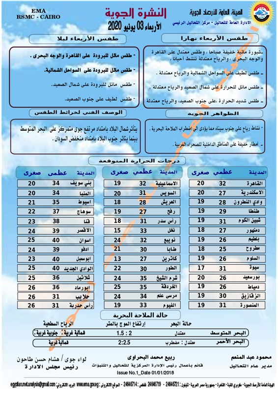 يتوقع خبراء هيئة الأرصاد الجوية ان يسود غداً الأربعاء طقس معتدل نهارًا على القاهرة الكبرى والوجه البحري لطيف على السواحل الشمالية الشرقية والغربية مائل للحرارة على جنوب سيناء وسلاسل البحر الأحمر و شمال الصعيد وشديد الحرارة على جنوب الصعيد.وقالت الأرصاد الجوية: إن الطقس من المتوقع أن يكون مائلًا للبرودة ليلًا على القاهرة الكبرى والوجه البحري والسواحل الشمالية الشرقية ووسط سيناء والسواحل الشمالية الغربية لطيفا على شمال وجنوب الصعيد.