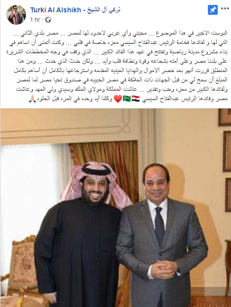 وكتب تركى آل الشيخ على صفحته الرسمية بموقع التواصل الاجتماعى فيس بوك:البوست الاخير في هذا الموضوع ... محبتي وأي عربي لاحدود لها لمصر ... مصر بلدي الثاني ... التي لها و لقائدها فخامة الرئيس عبدالفتاح السيسي معزه خاصة في قلبي ... وكنت أتمنى أن اساهم في بناء مشروع مدينة رياضية وتفتتح في عهد هذا القائد الكبير ... الذي وقف في وجه المخططات الشريرة على بلدنا مصر وعلى أمته بشجاعه وقوة ونظافة قلب وأيد ... ولكن حدث الذي حدث ... ومن هذا المنطلق قررت أنهو بعد حصر ألاموال والهدايا العينيه المقدمه واسترجاعها بالكامل أن أساهم بكامل المبلغ أن سمح لي من قبل الجهات ذات العلاقة في مصر الحبيبه في صندوق تحيا مصر لما لمصر ولقائدها الكبير من معزه وحب وتقدير ... عاشت المملكة ومولاي الملك وسيدي ولي العهد وعاشت مصر وقائدها الرئيس عبدالفتاح السيسي وكلنا أيد وحده في المره قبل الحلوه