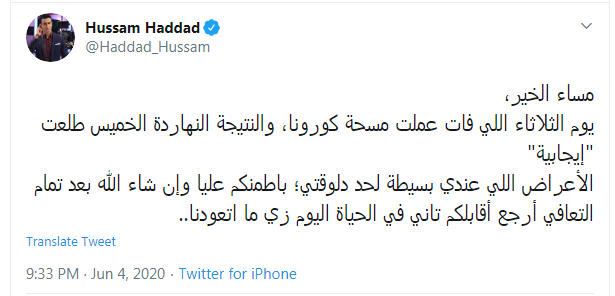وقال حسام حداد، في تدوينة نشرها عبر حسابه الشخصي على موقع "فيسبوك": "مساء الخير،يوم الثلاثاء اللي فات عملت مسحة كورونا، والنتيجة النهاردة الخميس طلعت "إيجابية"
