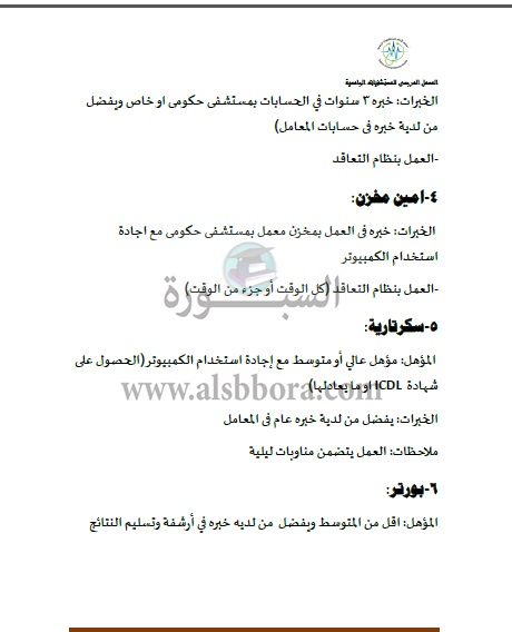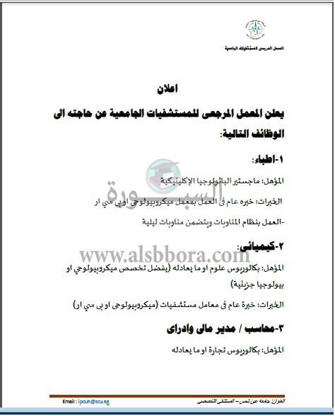 اعلنت وزارة التعليم العالى عن حاجته الى الوظائف (أطباء - كيميائي - محاسب/مدير مالي واداري - أمين مخزن - سكرتارية - بورتر) للعمل بالمعمل المرجعى للمستشفيات الجامعية كما يلي: