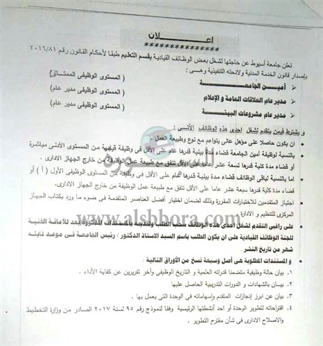 تعلن جامعة أسيوط وظائف جديدة من حملة المؤهلات العليا علما بأن أخر موعد للتقديم 22 يونيو وفقا لنص الاعلان التالي:-