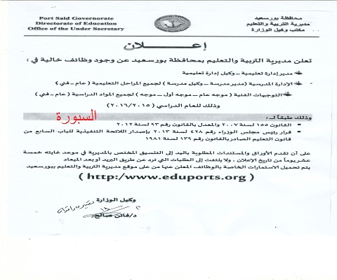 اعلنت مديرية التربية و التعليم بمحافظة بورسعيد عن وجود وظائف خالية فى